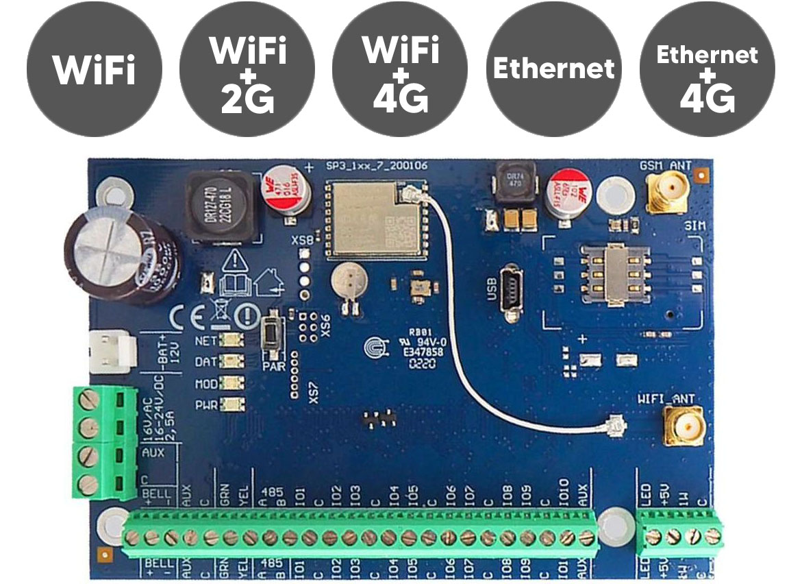 No separate communicator needed for Trikdis' own alarm control panel. The FLEXi SP3 includes an integrated WiFi + Ethernet / 2G / 4G communicator and is fully controllable via the free Protegus 2 app.